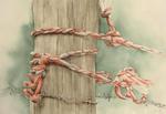 Touwen gebonden aan hekwerken in polders.